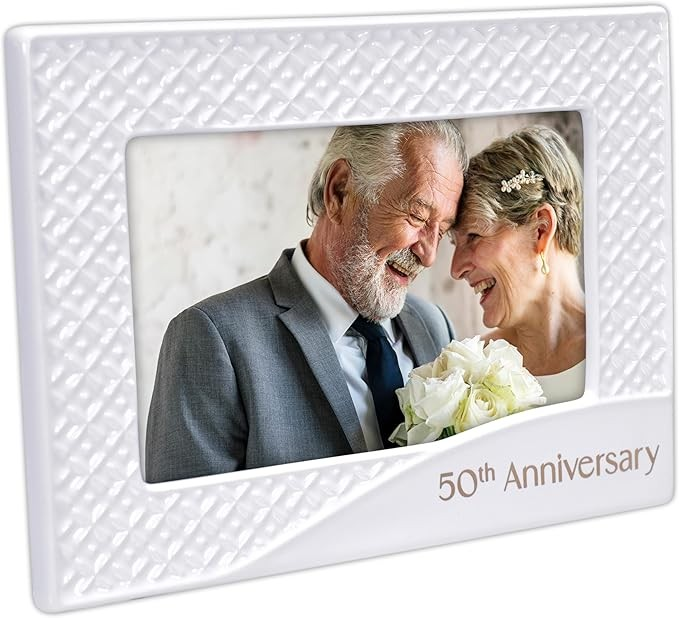 Ceramic 50th Anniversary picture frame holds a 4x6 photo.