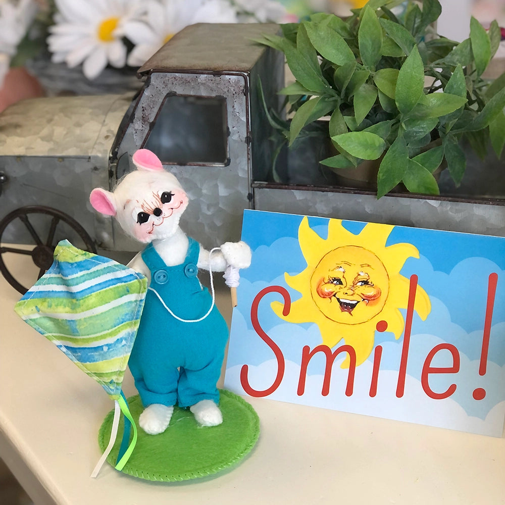 - The bright 5-inch white mouse wears teal overalls and holds a colorful light green, blue and white striped kite.