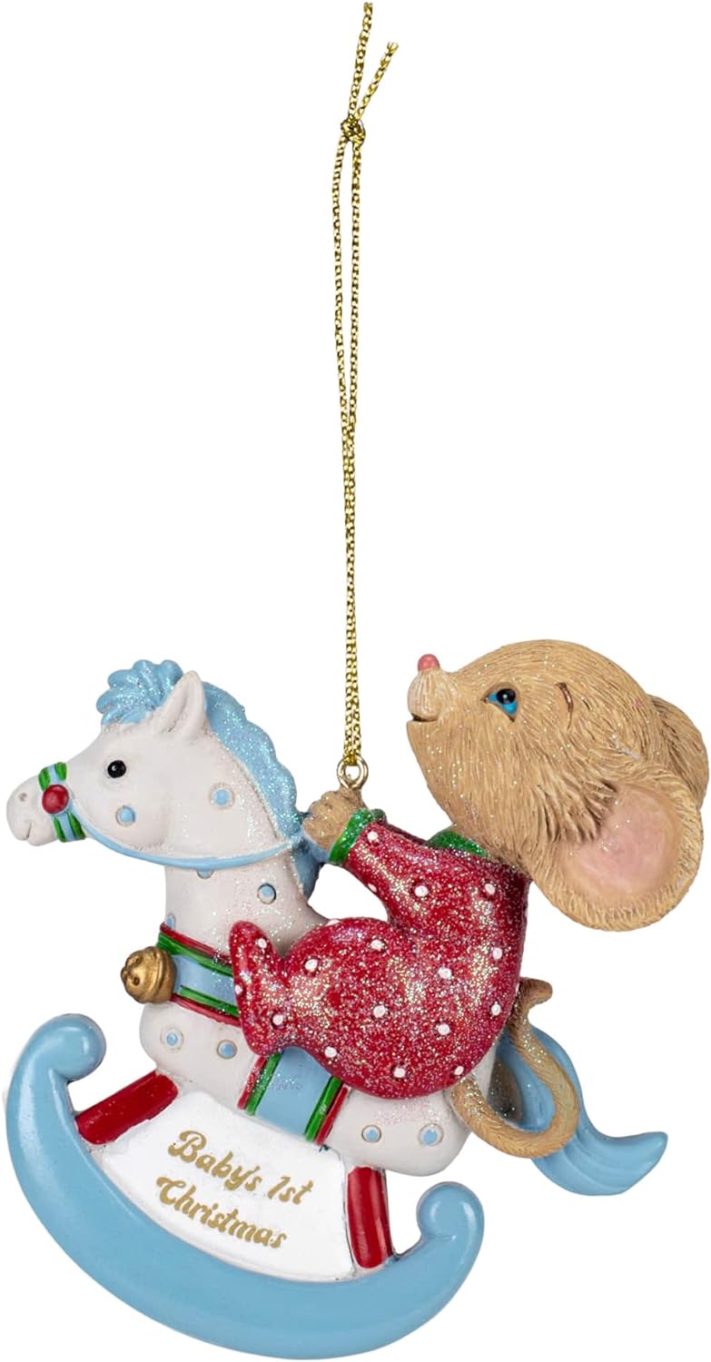 Baby's 1st Christmas blue and white rocking horse ornament with baby mouse dressed in red pj's.