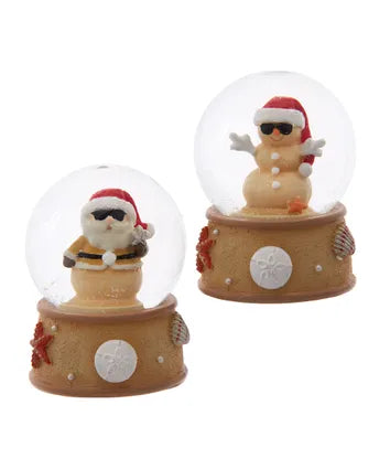 Choose either a beach sand Santa snow globe with a decorated base or a beach sand snowman snow globe with a decorated base.