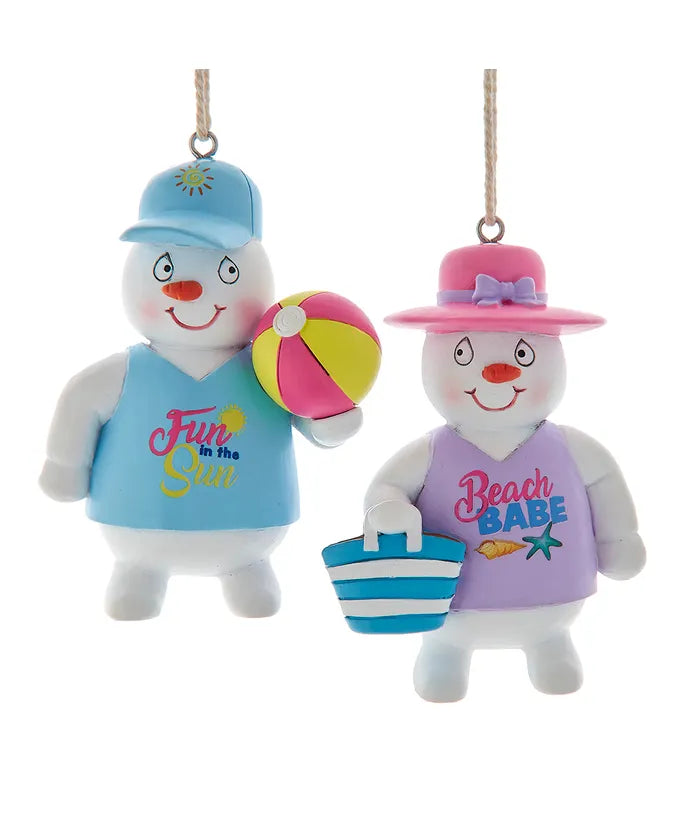 Choose either the beach snowman with a blue hat ornament or the beach snowman with a pink hat ornament.