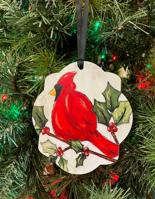 This colorful holiday ornament depicts a cardinal perched on a holly branch.