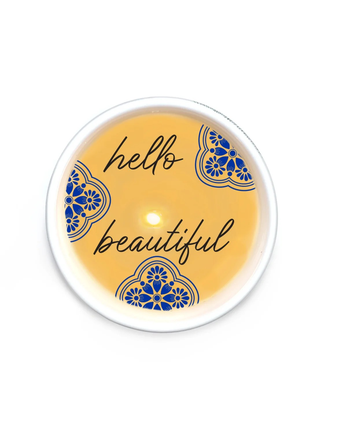 Ciao Bella "Hello Beautiful" 14oz soy wax ceramic reveal candle with ornate blue and white tile pattern.