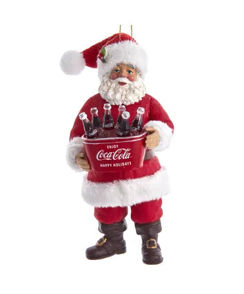 Santa holding an enjoy Coca-Cola happy holidays ice bucket filled with Coke bottles