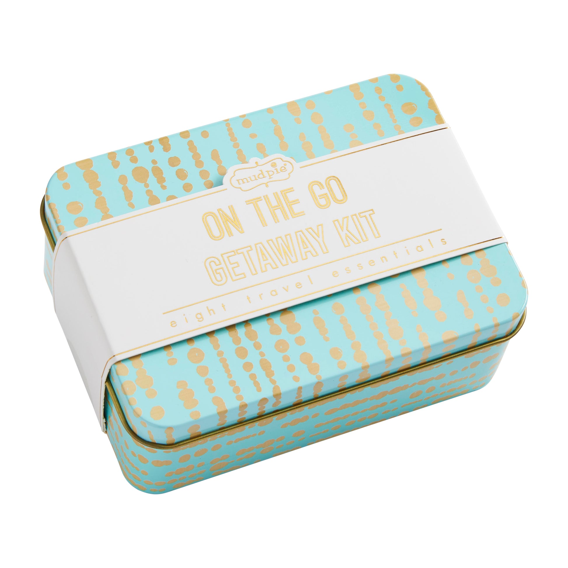 Our on-the-go getaway kit is a 9 piece set. The kit is a printed metal essential kit. The kit includes a brush compact, toothbrush, floss, ear plugs, sleep mask, hair ties, bobby pins and emery boards. These getaway kits are perfect for bachelorette trip gifts to ensure everyone is packed and prepared.
