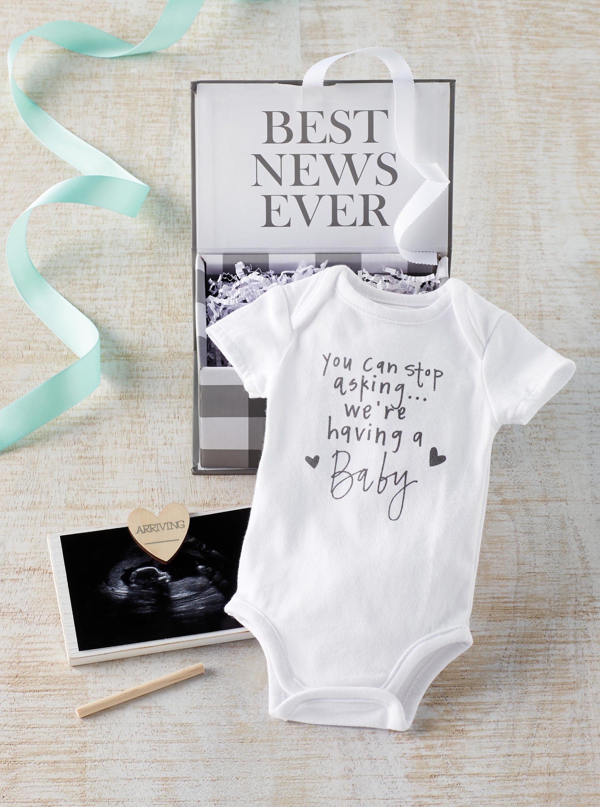 Surprise the special people in your life with this pregnancy announcement gift set! The printed jersey bodysuit and wooden sonogram magnet frame arrive in printed paper wrapped gift box. The bodysuit reads You can stop asking... we're having a baby" The giftbox reads "Best News Ever"."