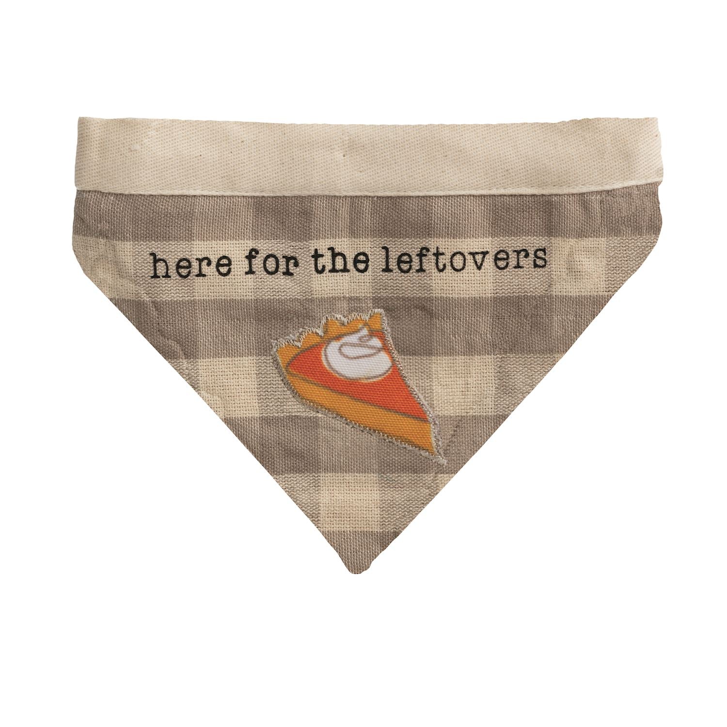 Multi holiday, reversible, cotton pet bandana has "here for the leftovers" slice of pie on one side and "official cookie tester" gingerbread man on the reverse side.