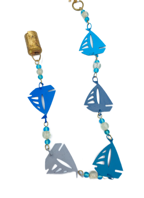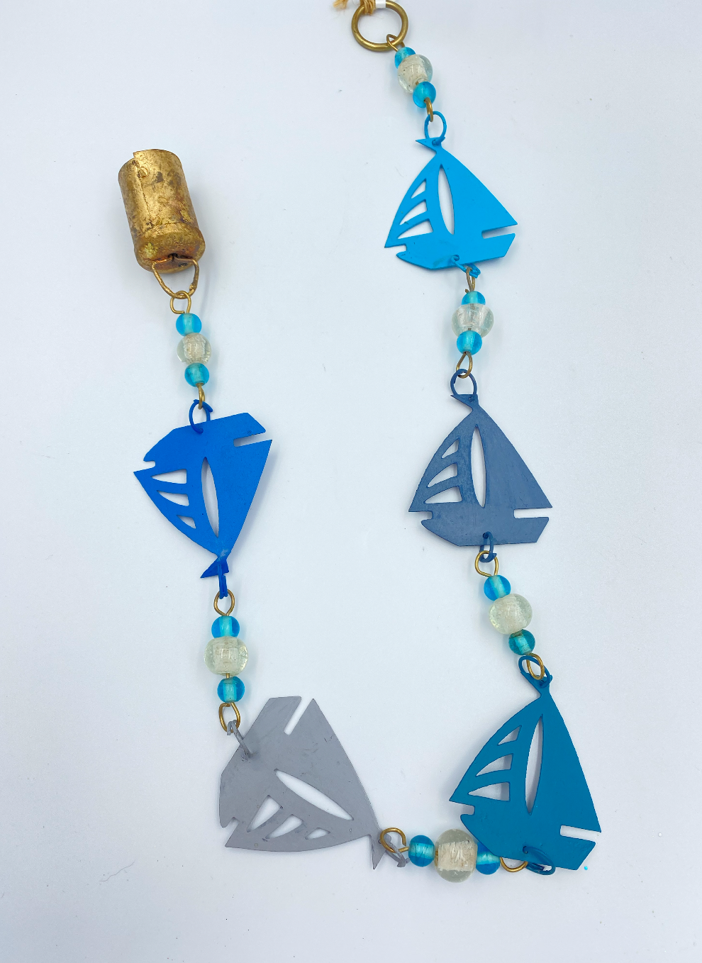 Several blue sailboats are scattered through beautiful beads on this chime.