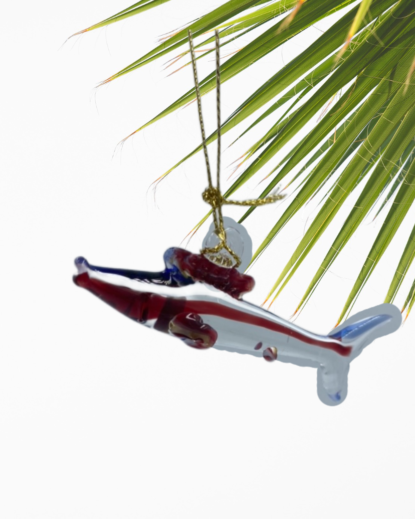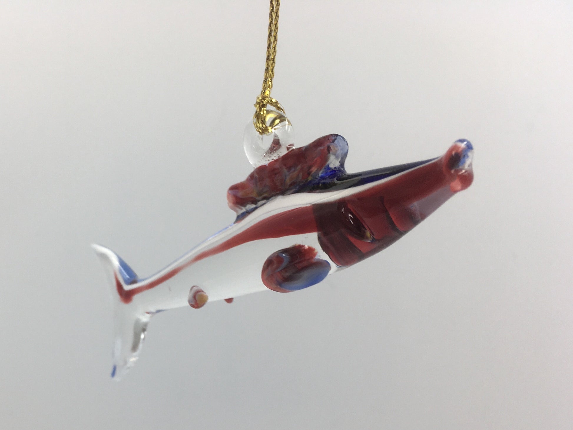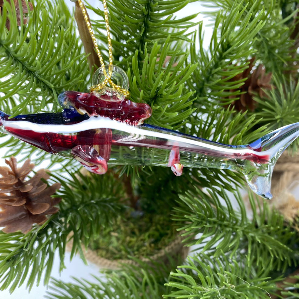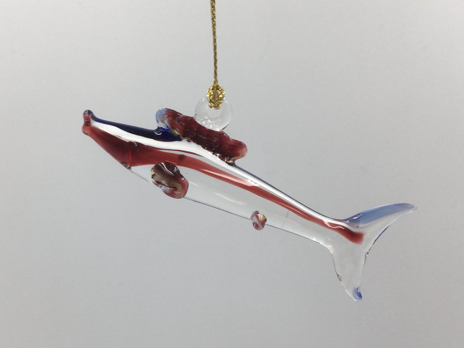 A red, white, and blue sardine ornament made of Egyptian Glass.