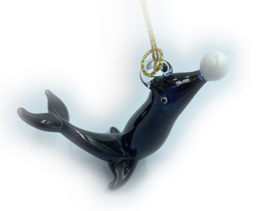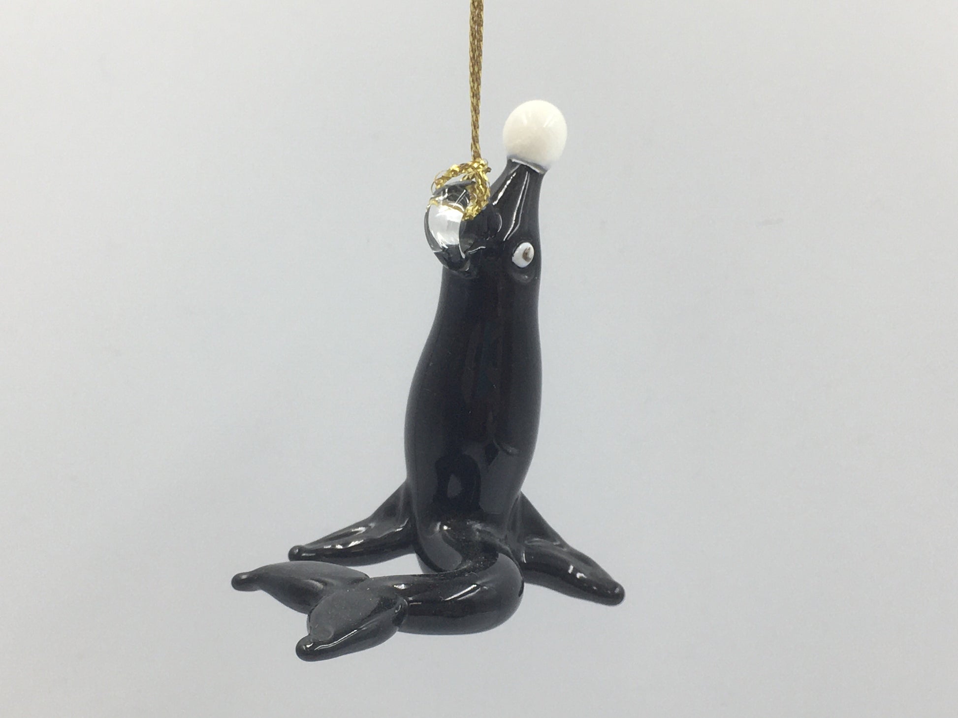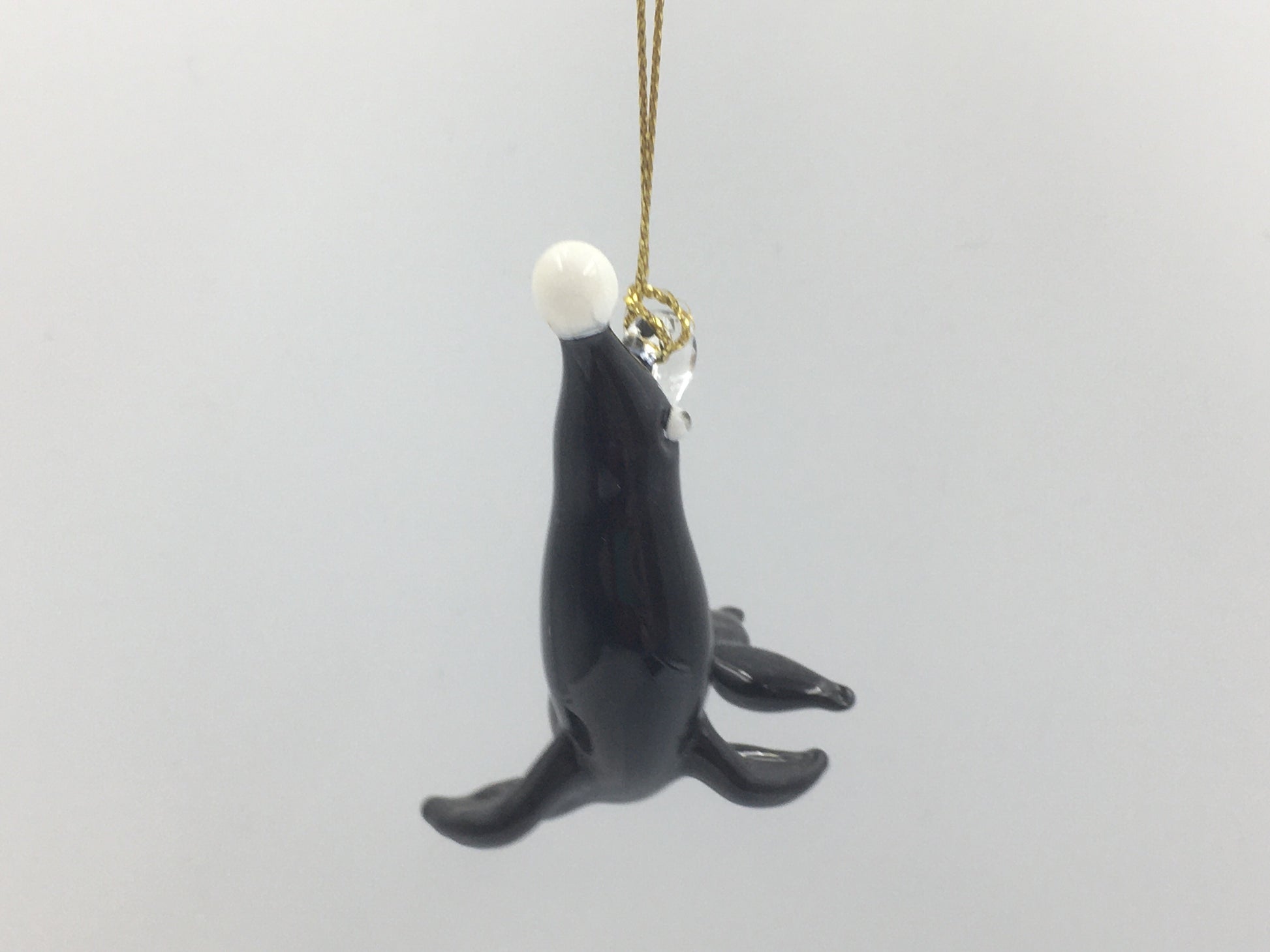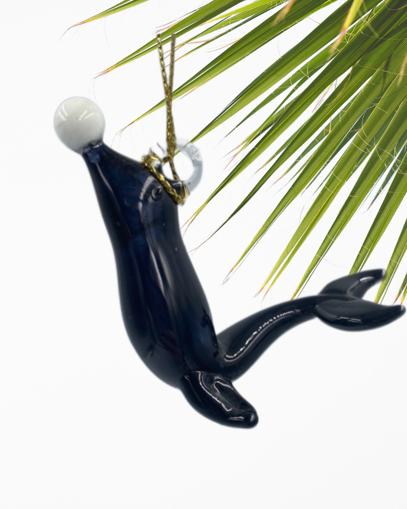 A Black Sea lion ornament made of Egyptian Glass, perfect for display or for hanging on your Christmas tree.