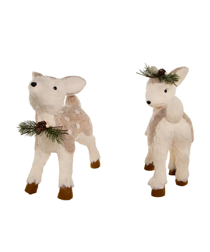 Choose either a sisal standing deer with frosted head greenery or a sisal standing deer with frosted neck greenery.