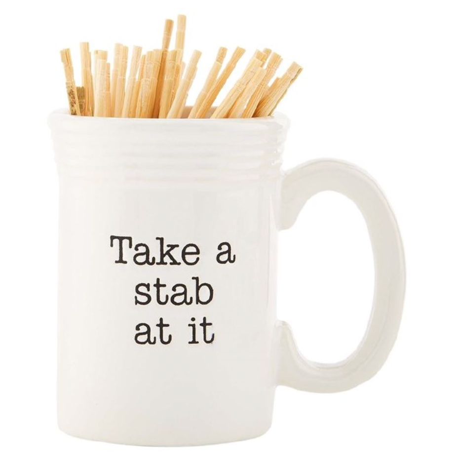 Debossed sentiment ceramic toothpick caddy arrives with one set of toothpicks.