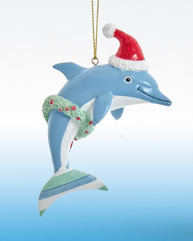 A dolphin ornament wrapped in a wreath and wearing a Santa hat. Accented with glitter.