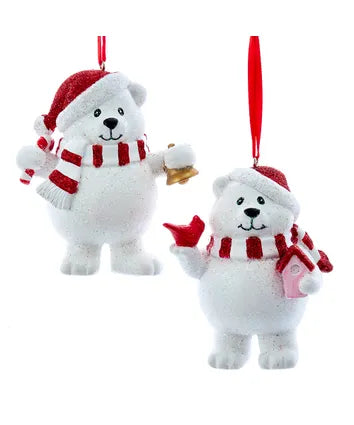 Choose either a white winter bear with a cardianl ornament or a white winter bear with a bell ornament.